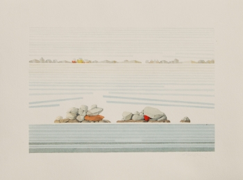 Sergio Camin ci presenta questa volta un ciclo di lavori incentrato sulle rocce del mare di Nord Ovest. A matita e acquarello sorgono cumuli, puri oggetti cognitivi: si tratta di scogli che sono macigni oppure briciole, gruppi montuosi statici o piccolo ghiaino che scivola in altri posti. Fondati saldamente al centro del pianeta terra, oppure leggeri, fluttuanti senza un peso?