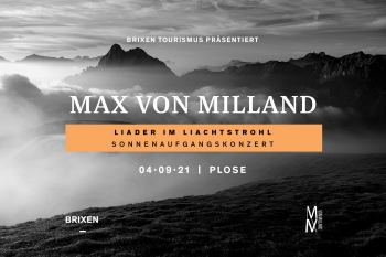 Sabato mattina 4 settembre non sarà una mattina qualunque. Quando il sole sorgerà intorno alle ore 6:40 a Bressanone 150 fortunati muniti di biglietto assisteranno sulla Plose ad un concerto speciale di Max von Milland, cantautore brissinese conosciuto anche oltre i confini altoatesini. Si fa chiamare con il nome del sobborgo di Bressanone dove è cresciuto: Milland (Millan). Max è cresciuto a Bressanone e ora vive a Monaco di Baviera come cantautore. Per lui casa non è uno spazio concreto, ma piuttosto una sensazione: una serata insieme agli amici, facendo musica o festeggiando. Questa estate Max torna a “casa” e accompagnerà i primi raggi del sole con un concerto speciale sulla Plose. Se non avete mai partecipato a un concerto all’alba, questa è l’occasione giusta, aspettando l’arrivo del sole e del nuovo giorno con lo sguardo rivolto verso l’orizzonte accompagnati dalle note del cantautore brissinese.