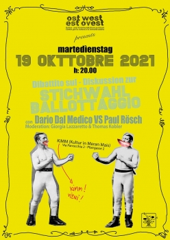 Già nell’estate del 2020 l’ost west club est ovest aveva organizzato un riuscitissimo dibattito fra i candidati sindaco dei maggiori partiti rappresentati nel Consiglio comunale, cui avevano partecipato più di 200 meranesi presso l’ost west Country Club di parco Marconi. Il prossimo martedì 19 ottobre alle ore 20.00, presso la sala del KiMM (Kultur im Meran Mais) di fianco alla chiesa di Maia Bassa, l’associazione culturale meranese, nota anche per le vivaci serate di discussione su temi di attualità sociale, ha organizzato un nuovo dibattito, questa volta solamente fra i due candidati al ballottaggio.
