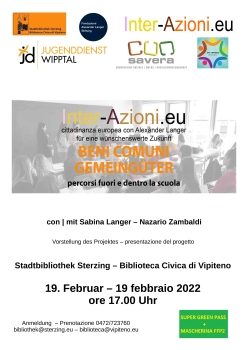 Il progetto “Beni comuni” è nato da una collaborazione della Biblioteca Civica di Vipiteno con Inter-Azioni, l’IPC Alexander Langer di Vipiteno e il Jugenddienst Wipptal. La manifestazione sarà bilingue (italiano/tedesco) e la partecipazione è gratuita.
