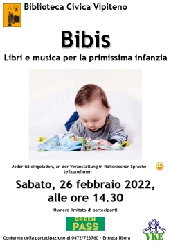 Sabato 26 febbraio, alle ore 14.30 parte l’incontro “Bibis – Libri e musica per la primissima infanzia” nella Biblioteca Civica di Vipiteno, dedicato ai bambini con un’età dai 0 ai 3 anni. La musicista Erica Rizzo presenterà libri adatti ai più piccoli offrendo contemporaneamente la possibilità di giocare con la musica.