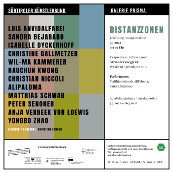 Distanzzonen è un progetto di scambio tra il Südtiroler Künstlerbund e la città di Monaco. Nel novembre 2021, sei coppie di artisti, composte rispettivamente da un artista sudtirolese e un artista di Monaco, hanno unito le forze e sviluppato progetti comuni che sono stati esposti a novembre alla halle50 dei Domagk Ateliers di Monaco e al LOFT di Ansbach, e ora alla Galleria Prisma di Bolzano.