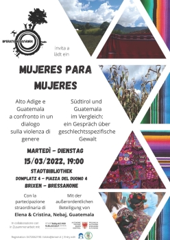 Operation Daywork, associazione senza scopo di lucro di Bolzano, assegna annualmente un Premio Diritti Umani ad un’associazione che si occupa di promuovere la difesa dei diritti umani nel proprio contesto. Quest’anno, le vincitrici sono le donne di ASOREMI, un’organizzazione guatemalteca tutta al femminile che promuove il rispetto dei diritti delle donne e lotta contro le disuguaglianze di genere. Una piccola delegazione di ASOREMI, sarà ospite di Operation Daywork: accogliendole, promuoviamo il dialogo e lo scambio culturale tra la popolazione altoatesina e le donne guatemalteche.