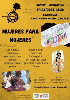 Operation Daywork, associazione senza scopo di lucro di Bolzano, assegna annualmente un Premio Diritti Umani ad un’associazione che si occupa di promuovere la difesa dei diritti umani nel proprio contesto. Quest’anno, le vincitrici sono le donne di ASOREMI, un’organizzazione guatemalteca tutta al femminile che promuove il rispetto dei diritti delle donne e lotta contro le disuguaglianze di genere. Una piccola delegazione di ASOREMI, sarà ospite di Operation Daywork: accogliendole, promuoviamo il dialogo e lo scambio culturale tra la popolazione altoatesina e le donne guatemalteche.
