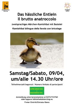 Le lettrici Margit e Maria Nunzia ad aprile presenteranno la favola „Il brutto anatroccolo“ di Hans Christian Andersen in forma kamishibai – teatrino di legno – e invitano tutti i bambini ad un lavoro di bricolage. Il prossimo incontro di favole bilingue si terrà sabato 21 maggio 2022.