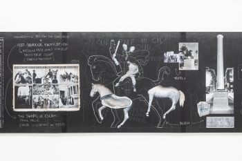Attraverso un approccio practice-based alla ricerca storiografica, Alessandra Ferrini costruisce una costellazione di personaggi e storie marginalizzate che evidenziano zone di contatto tra le periferie dell’impero coloniale italiano. Il gesto di editare materiali iconografici e testuali attraverso media e linguaggi differenti, tra cui la voce stessa dell’artista che propone una possibile lettura delle risonanze tra queste storie, offre una riflessione su pratiche militanti di scrittura e traduzione, ma anche sul potenziale etico e politico della pratica artistica.
