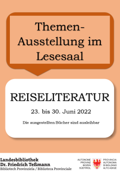 Fino alla fine di giugno 2022, nella Sala lettura della Biblioteca Provinciale Dr. Friedrich Teßmann saranno esposti racconti di viaggio pubblicati negli ultimi anni. Rendono vivibili le esperienze dei viaggiatori e ci incoraggiano a condividere i loro viaggi nei nostri pensieri.
