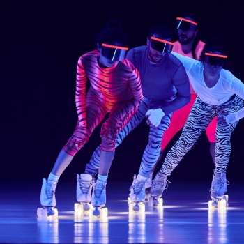 Un quartetto sui pattini a rotelle futuribile. Un’idea di corpo in movimento e di velocità inusuale per la scatola nera di un teatro, ma perfetta per un’edizione di Festival dedicata alle sfide intraprese dai corpi, allo sport come estensione del movimento performante.
