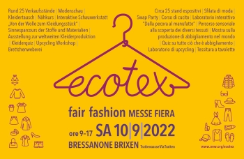 Il 10 settembre organizzeremo per la terza volta Ecotex, l‘unica fiera del tessile ecologica e equo solidale dell’Alto Adige. Questa volta l’iniziativa avrà luogo per la prima volta in via Tratten a Bressanone dalle ore 9 alle ore 17. L’iniziativa, inoltre, intende accendere i riflettori su diversi aspetti del mercato del tessile: condizioni di lavoro eque, produzione rispettosa dell’ambiente e consumo alternativo dei prodotti tessili.