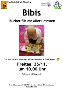 Venerdì 25 novembre 2022 nella Biblioteca Civica di Vipiteno avrà luogo alle ore 10.00 il regolare incontro di libri "Bibis - Libri per la primissima infanzia".