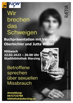 Mercoledì 22 febbraio 2023, alle ore 20.00, presso la Biblioteca Civica di Vipiteno, l’autrice e psicoterapeuta Veronika Oberbichler presenterà il suo libro "Wir brechen das Schweigen - Betroffene sprechen über sexuellen Missbrauch" (Rompiamo il silenzio - le vittime parlano di abusi sessuali) in una conversazione con la direttrice della biblioteca Karin Hochrainer. Estratti dalle interviste alle persone colpite saranno letti dalla relatrice e redattrice Jutta Wieser.