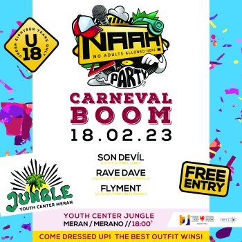 Il 18/02/2023, presso il centro giovani Jungle, in Via San Giuseppe 1 a Merano, si terrà un evento molto speciale, aperto solo ai giovani sotto i 18 anni. Questa fascia d’età è spesso esclusa dagli eventi perché non “redditizia”. Tuttavia, è proprio questo target che ha la necessità di avere uno spazio per sé, per incontrarsi e festeggiare. A sostegno di ciò, l’associazione dei centri giovan dell’Alto Adige “netz” ha avviato l’iniziativa “NAAH” (No Adults Allowed Here), che prevede una serie di eventi nei vari centri giovanili.