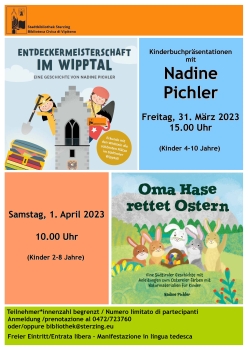 L'autrice dell’Alta Val d’Isarco, Nadine Pichler, presenterà i suoi due nuovi libri per bambini, in due diversi giorni, nella Biblioteca Civica di Vipiteno: venerdì 31 marzo, alle ore 15.00, tutti i bambini dai 4 ai 10 anni sono invitati a conoscere il libro "Entdeckermeisterschaft im Wipptal" (Il Campionato degli esploratori nell’Alta Val d’Isarco) e a risolvere indovinelli e portare a termine compiti emozionanti insieme ai Wippis.