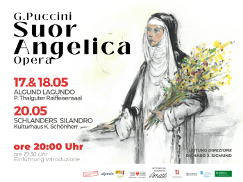 L'associazione culturale Amaté vi invita alla casa culturale di Lagundo il 17 e 18 maggio 2023 e alla casa della cultura Karl Schönherr a Silandro il 20 maggio 2023 per l'opera in un atto unico "Suor Angelica" di Giacomo Puccini. La produzione dell'opera è diretta da Richard J. Sigmund.