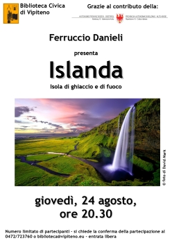 Ferruccio Danieli, giovedì 24 agosto, alle ore 20.30, presso la Biblioteca Civica di Vipiteno, condurrà i partecipanti alla scoperta dell’affascinante Islanda, grazie alla proiezione di foto e all’interessante commento sulle proprie esperienze di viaggio. Lasciatevi trasportare quindi in un’Islanda, terra di miti e leggende, colonizzata in tempi antichi dai vichinghi e nota soprattutto per le incantevoli bellezze naturalistiche, più o meno incontaminate e dai ricchi contrasti: ghiacciai e vulcani, fiordi e imponenti formazioni rocciose, spiagge e lagune termali, paesaggi marini e riserve naturali spettacolari.