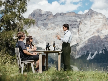 Questo luogo magico sopra La Val invita al pensiero bello, pulito, sensuale. Noi ce lo godiamo pienamente degustando i vini spumanti dell’Alto Adige, ammirando una vista spettacolare dai Prati Larcen?i a La Val sulla cima Nove e Dieci del gruppo Santa Croce.