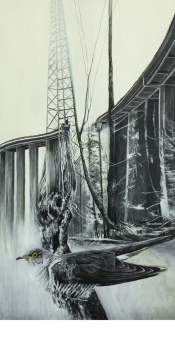Orbene, Elisabeth Frei cattura frammenti di natura. Li trova in espressivi tronchi d'albero che giacciono lì come morti, defogliati, senza vita, spaccati, escavati e danneggiati all'interno da vermi e scarabei di corteccia, rosicchiati oltre ogni riconoscimento. I tronchi ramificati, tuttavia, hanno ancora un residuo di vita. Questo ricciolo di vita riflette gli artefici di questa felicità transitoria: l’uomo succube del pensiero evolutivo. Sono immagini che si presentano in un contesto tranquillo, come se la rivoluzione organizzata dalla natura fosse l'unica cosa certa che ci si possa ancora aspettare. Sullo sfondo del castello Trostburg, l'autostrada è vuota di veicoli, la ferrovia è interrotta, piante spoglie si spingono lottando verso l'alto e scompaiono nel reticolo di una sottostazione elettrica. Ripetutamente troviamo tronchi di betulla, anche piccoli, che si affermano liricamente contro sfondi arborei cornuti. Animale e natura si fondono in un simbolo, l’opera umana provoca il disturbo. Elisabeth Frei ha interpretato l'idea della "Galleria di base del Brennero" nella Valle Isarco come un tubo nel passato. Le sezioni degli alberi mostrano reminiscenze del Tesoro di Loreto, vedute di un'accogliente familiarità e di interni storici, quasi un omaggio al luogo della mostra. Il tubo albero si trasforma in un'arteria stradale, la corteccia riflette il costruito. Ciò che è stato detto da Marcel Brion nella sua opera standard "Jenseits der Wirklichkeit. Phantastische Kunst" (Oltre la realtà. Arte fantastica) del 1962 sulla pittura del fantastico, si applica senza dubbio alle opere di Elisabeth Frei: il fantastico si rifrange qui nella surrealtà della natura. L'orrore e l’illeso, il comune e il bello si trovano uno accanto all'altro; sono immagini di un’alterità di questo mondo, che mette paura, che si spezza solo quando appare la visione di un altro mondo. I manufatti del passato si ergono ambiguamente tra le rovine della natura, il fantastico diventa un monito contro ogni distruzione e follia umana. E allo stesso tempo, una vana pace pittorica regna sulla visione di uno sviluppo che è solo in declino o sospeso. La crescita diventa uno spettro spaventoso senza futuro. Ciò che è cresciuto rimane altrettanto morto e rigido. Solo di tanto in tanto un uccello (alla maniera di Alexander Koester) si alza in volo e cerca il largo. Ma ci si chiede: dove vuole andare? E nel vortice degli anelli annuali ordinati riecco Dürer ancora una volta, con la sua Fortuna che fluttua sicura sulla sua sfera, lasciando la cittadina nella buca di legno erosa sotto di lei. E la sua immagine sovradipinta appare anche, con occhiali scuri come una caricatura, alla radice di un doppio tiglio. Un dettaglio a parte: negli occhiali si riflette l'ingorgo autostradale.