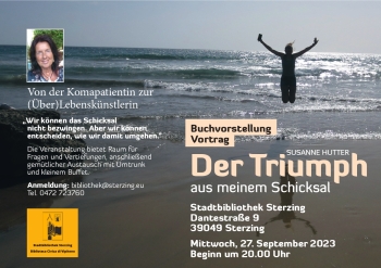 Mercoledì 27 settembre 2023, alle ore 20.00, la scrittrice e giornalista Susanne Hutter sarà ospite della Biblioteca Civica di Vipiteno. In questa serata, l'altoatesina di origine tedesca leggerà dal suo libro "Der Triumph aus meinem Schicksal" (Il trionfo nel mio destino) e racconterà la sua esperienza di paziente in coma e il difficile ritorno alla vita.