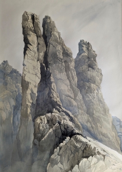 Le sue opere raffigurano scorci di montagne conosciute, sebbene i soggetti appaiano in qualche modo diversi, osservati sotto una nuova luce, ricostruiti attraverso il colore e la struttura. Impiegando diverse tecniche dell’acquerello – velature, granulazioni, sfumature – l’artista crea una raffinata atmosfera cromatica e “ariosa”, in cui luce e corporeità delle formazioni rocciose giocano un ruolo significativo. Oltre a una forte vivacità, le opere esprimono anche una certa fugacità del paesaggio alpino. [Testo: Richard Firler]