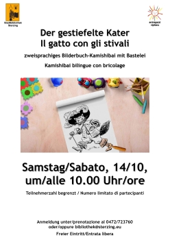 Sabato 14 ottobre, nella Biblioteca Civica di Vipiteno, ripartono, alle ore 10.00, gli incontri di favole bilingui dedicati ai bambini dai tre ai sei anni. A ottobre le nostre lettrici Margit e Giulia presenteranno la favola „Il gatto con gli stivali“ dei fratelli Grimm con il kamishibai (teatrino di legno) e invitano tutti i bambini a un lavoro di bricolage. Il prossimo incontro avrà luogo sabato 25 novembre, sempre alle ore 10.00, nella Biblioteca Civica di Vipiteno.