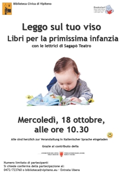 Insieme alle bravissime lettrici ad alta voce di Sagapò Teatro, invitiamo tutti i bambini tra i 6 e i 24 mesi alla manifestazione “Leggo sul tuo viso”, che avrà luogo presso la Biblioteca Civica di Vipiteno, mercoledì 18 ottobre 2023, alle ore 10.30.