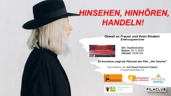 Venerdì 24 novembre 2023, in collaborazione con la Rete antiviolenza Wipptal, si svolgerà l'evento informativo "Hinsehen hinhören, handeln!“. L'evento avrà luogo alle ore 18.00 nella Biblioteca Civica di Vipiteno. Verranno presentate le esperienze di persone colpite e ci sarà spazio per parlare con esperti della violenza contro le donne e i bambini. A seguire, il Filmclub proietterà alle ore 20.00 il film "Der Taucher".
