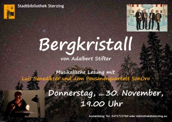 Giovedì, 30 novembre 2023 alle ore 19.00, Luis Benedikter leggerà nella Biblioteca Civica di Vipiteno, il racconto più popolare di Adalbert Stifter "Bergkristall", che nella sua versione originaria si chiama "Der heilige Abend". Il quartetto di tromboni SonOro fornirà un accompagnamento musicale alla lettura.