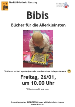 Venerdì 26 gennaio 2024, alle ore 10.00, nella Biblioteca Civica di Vipiteno, avrà luogo l’incontro mensile con i libri "Bibis - Libri per la primissima infanzia".