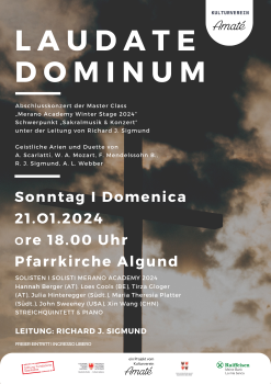 LAUDATE DOMINUM Concerto Sacro 21.01.2024 presso la Chiesa Parrocchiale di LagundoGli amanti della musica sacra possono attendersi un concerto speciale.Domenica 21 gennaio 2024 alle ore 18.00, i partecipanti alla "Merano Academy Winter Stage 2024" dell'associazione culturale Amaté si esibiranno nella Chiesa Parrocchiale di Lagundo, portando in scena capolavori della musica sacra.I solisti Hannah Berger (D), Loes Cools (B), Tirza Gloger (A), John Sweeney (USA) e Maria Theresia Platter (Alto Adige) eseguiranno arie sacre ed ensemble di Stradella, Pergolesi, Mozart, Sigmund, Webber e Mendelssohn.I solisti saranno accompagnati da un ensemble di archi composto da Marcello Defant, Michael Isac Girardi, Nicola Fadanelli, Giovanna Trentini e dal pianista Yijun Shen, sotto la direzione di Richard J. Sigmund.I visitatori del concerto potranno godere di un concerto in chiesa straordinario.Ingresso libero.Informazioni: www.amatemerano.com