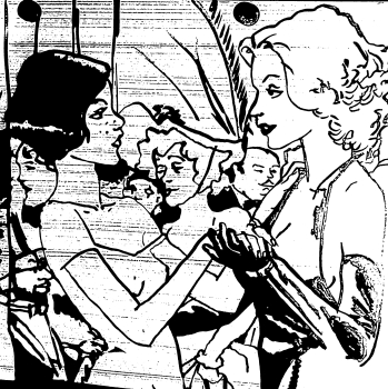 Installazione con cantastorie di un episodio narrato con disegno (pittura a inchiostro su striscia unica di carta parati (670x60cm) si narra una avventura con colpo di fulmine ad una festa con ballo: