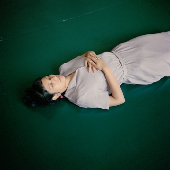 Su un‘altra parete bianca, in un‘altra foto, una donna quasi nuda. Un drappeggio giallo attorno al collo le ricopre leggermente la parte superiore del corpo, da sinistra a destra. Protezione fragile. Vulnerabilità. Guarda lontano dall‘osservatore verso la sorgente di luce, nascosta agli occhi di quest’ultimo. Ecco un ulteriore luogo di desiderio. Seguendo e lasciandosi avvolgere da tracce, strutture e pieghe, esse forniscono direzione e protezione, promessa e incertezza.