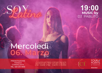 Questo mercoledì preparati a lasciarti avvolgere dalle melodie coinvolgenti della musica latina. Dalle 19:00 alle 23:00, ti aspetta una serata ricca di ritmi coinvolgenti e delle migliori canzoni del genere latino. "Soy Latino Special Aperitif" è un appuntamento da non perdere per ballare salsa, bachata e reggaeton: un'esperienza unica e indimenticabile.