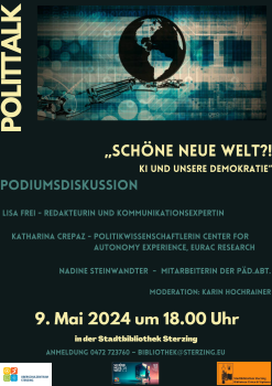 La manifestazione ha luogo nell’ambito della serie "PolitTalk" della biblioteca civica e dell’Oberschulzentrum Sterzing, come anche delle Giornate d’azione per la cittadinanza attiva 2024 della Provincia Autonoma di Bolzano sul tema IA e digitalizzazione.
