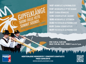 Vivete le suggestive esibizioni delle bande musicali, il suono potente degli "Alphornbläser" e le danze coinvolgenti degli "Schuhplattler". Ogni evento offre l'opportunità unica di combinare il suggestivo scenario montano con i suoni e gli spettacoli della cultura altoatesina.