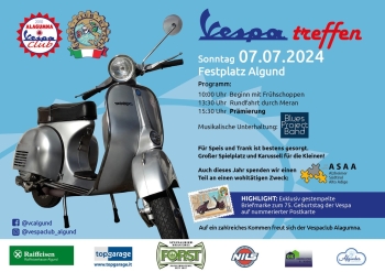 Il Vespaclub Alagumna Algund vi invita Domenica 7 luglio 2024 al tradizionale raduno del Vespaclub nella piazza delle feste a Lagundo.
