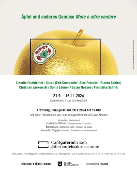 Gli artisti della mostra collettiva ripercorrono i processi produttivi dell'industria delle mele. Mostrano le connessioni tra la commercializzazione della frutta e quella della regione turistica, esaminano gli stereotipi di genere e la gestione della tradizione. Anche il nostro rapporto con la natura, l'origine del cibo e il modo in cui alcuni alimenti evocano un senso di familiarità giocano un ruolo in “Mele e altre verdure”. Con installazioni basate sulla ricerca, tocchi di umorismo e scenari horror, un sito web interattivo, opere video, fotografie e serigrafie, Claudia Eichbichler, Gut++ (Erik Campanini, Alex Foradori, Bianca Schick), Christian Jankowski, Sonia Leimer, Suzan Noesen e Franziska Schink incoraggiano la riflessione e la discussione.