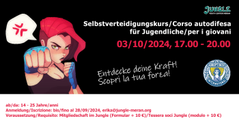 Giovedì 3 ottobre, il Jungle ti invita a un corso di autodifesa per giovani! Il corso è aperto a tutti i giovani a partire dai 14 anni. Inizieremo alle 17.00 e ci alleneremo insieme fino alle 20.00. Puoi iscriverti entro il 28/09/2024 inviando un’e-mail a erika@jungle-meran.org oppure tramite WhatsApp al numero 3282748950.