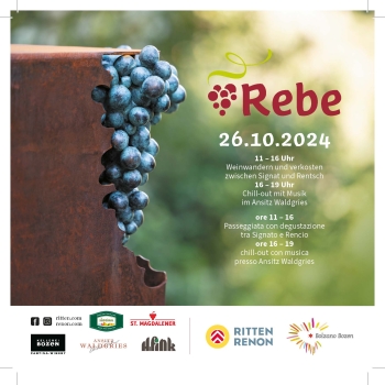 Ore 11-16: In mezzo ai vigneti del Renon e di Bolzano i viticoltori invitano a degustare il loro vino lungo il sentiero artistico REBE. In 5 postazioni, i viticoltori offrono in degustazione i loro vini che crescono nelle rispettive altitudini tra Rencio e Signato. Dal corposo Lagrein all'aromatico Gewürztraminer fino allo speziato Kerner: sono ben 13 le varietà di uva che maturano lungo i 3,5 km del sentiero del vino REBE!