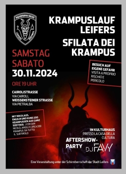 I "Brontntol Tuifl" di Laives invitano alla corsa dei Krampus il 30 novembre a partire dalle ore 19 lungo via Cairoli fino all'incrocio di via Pietralba e via Dante. Ci sarà anche uno stand con cibo e bevande. Quest'anno parteciperanno alla corsa 11 gruppi e oltre 200 Krampus provenienti da tutto l'Alto Adige.