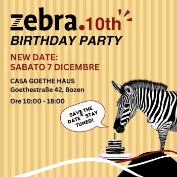 Siete calorosamente invitati*e il 7 dicembre, dalle ore 10:00 alle 18:00, alla Casa Goethe Haus nel cuore di Bolzano per un momento conviviale. Tra brindisi, stuzzichini e sorprese intrattenenti, rivivremo insieme i momenti salienti del primo decennio di zebra.. Ci sarà un angolo dedicato anche per i*le bimbi*e e non mancherà la giusta atmosfera musicale con performance dal vivo. Noi non vediamo l’ora di conoscervi di persona e di festeggiare assieme, quindi vi aspettiamo numerosi*e!