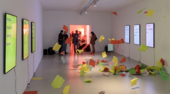Benvenuta, benvenuto ad Ar/Ge Kunst. Siamo dentro Fluo Swan, un esercizio commerciale che vende prodotti assicurativi per ogni più remota evenienza.