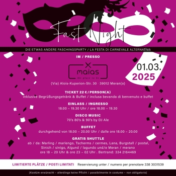 Fast night con musica da discoteca degli anni 70,80 e 90 con CJ ALE. Ingresso: 22 euro inclusa bevanda di benvenuto e buffet (dalle ore 18 fino alle ore 20) Ingresso solo su prenotazione telefonica dalle ore 18 fino alle ore 19.30. Tel: 3383031539