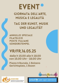 Il prossimo venerdì 16 maggio, dalle ore 15:00 alle 18:00, Piazza del Tribunale a Bolzano si trasformerà in un luogo di incontro, cultura e impegno sociale con l’evento "Arte, Musica e Legalità". Promosso dal Comitato Provinciale Unicef Bolzano e dall’Associazione Venusta di Silandro, in collaborazione con l’Azienda Servizi Sociali di Bolzano, l’evento mira a rafforzare il senso di comunità e sensibilizzare sui temi di inclusione, giustizia e diritti dei più giovani.
