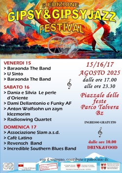 Amici il 15, 16 e 17 agosto, l'associazione Sinta Nevo Drom celebrerà la sesta edizione del Gipsy&Gipsy Jazz Festival in Piazza Alexander Langer a Bolzano sui prati della Talvera. Tre serate in cui si potrà ballare con la musica di noi Sinti, o semplicemente ascoltarla e rilassarsi. Tre serate in cui le diverse culture dell'Alto Adige parlano un'unica lingua, quella della musica. E c’é anche da mangiare e bere.