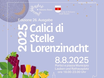 Vi invitiamo a trascorrere una piacevole serata alla scoperta dei vini tipici della città. Calici di Stelle è l’occasione per conoscere di persona i produttori, che saranno lieti di raccontare i loro vini. Da non perdere inoltre i banchetti per buongustai con i prodotti tipici dell’Alto Adige.