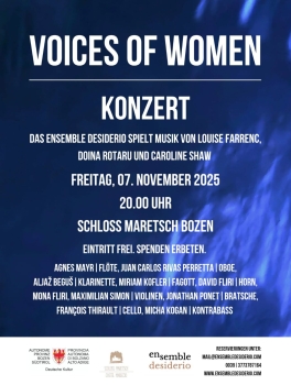 Il concerto "Voices of Women" si terrà venerdì 07 novembre 2025 alle ore 20:00 presso Castel Mareccio a Bolzano. L'ingresso è gratuito.