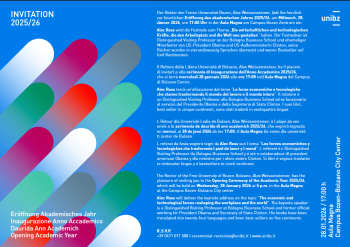 Mercoledì 28 gennaio 2026, nell'Aula Magna del campus unibz Bolzano Centro, il Rettore della Libera Università di Bolzano Prof. Alex Weissensteiner inaugurerà ufficialmente l'Anno Accademico 2025/26.