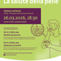 La salute della pelle non è questione di fortuna, ma è principalmente il risultato di comportamenti corretti e di prevenzione mirata. Durante il primo incontro del Forum Salute Alto Adige 2026 verranno presentate informazioni pratiche sulla cura quotidiana della pelle, come l'adozione di abitudini salutari, l'impiego di prodotti specifici e l'assunzione di vitamine utili. Saranno inoltre veicolate nozioni base in materia di fattori di rischio, tecniche di auto-esame e precauzioni da seguire per chi svolge attività all'aperto.