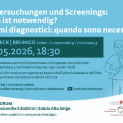 Quando è veramente necessario un esame diagnostico? E quali soni i principali programmi di screening in atto? A queste e altre domande risponderanno in questa occasione gli esperti dell’Azienda sanitaria dell’Alto Adige. Al centro dell’attenzione vi saranno in particolare i programmi di prevenzione, che mirano a individuare precocemente le malattie e a migliorare sensibilmente le possibilità di trattamento.