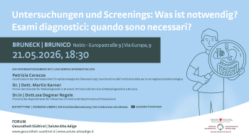 • Quando è veramente necessario un esame diagnostico? E quali soni i principali programmi di screening in atto? A queste e altre domande risponderanno in questa occasione gli esperti dell’Azienda sanitaria dell’Alto Adige. Al centro dell’attenzione vi saranno in particolare i programmi di prevenzione, che mirano a individuare precocemente le malattie e a migliorare sensibilmente le possibilità di trattamento. “Esami diagnostici: quando sono necessari?”, una serata informativa con - Patrizia Corazza, Coordinatrice dell’Unità Aziendale per la Sorveglianza Epidemiologica; - Dott. Martin Karner, Primario del Servizio di Radiodiagnostica a Brunico; - Dott.ssa Dagmar Regele, Primaria del Dipartimento di Prevenzione.